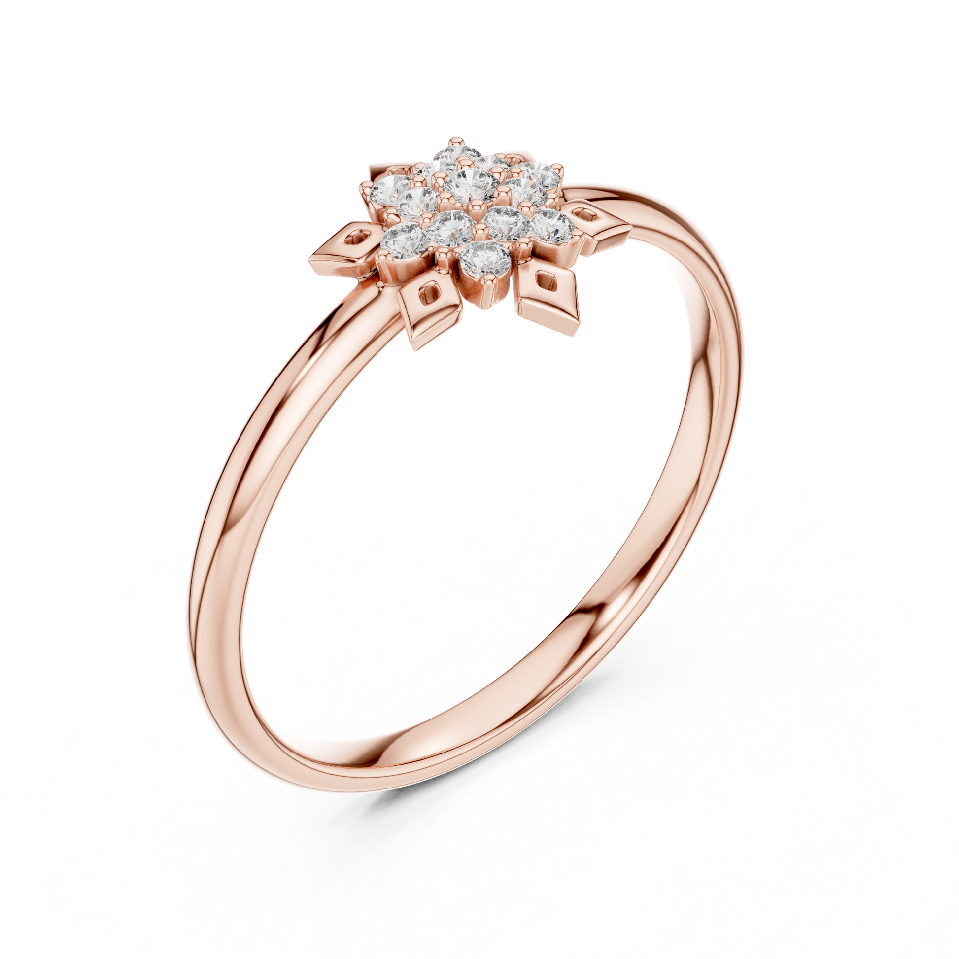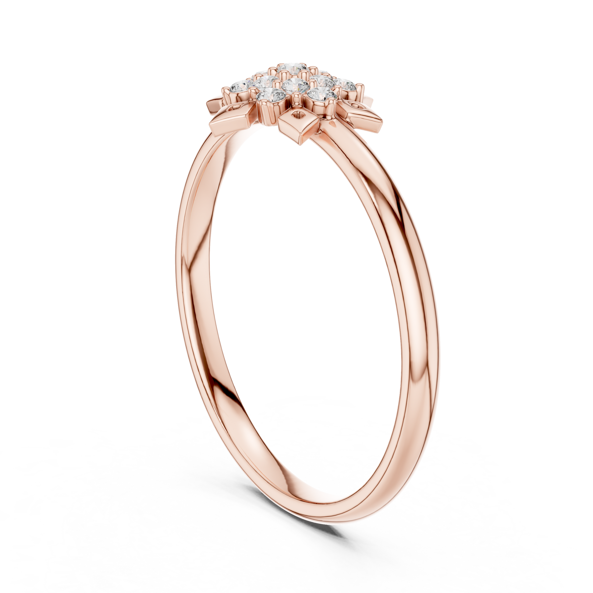 This ring showcases a brilliant diamond cluster at the core, framed by sharp, diamond-shaped rose-gold accents that form a refined emblem-like silhouette. The contrast between soft sparkle and bold geometry creates a look that is modern, confident, and unmistakably distinctive. Every angle reflects precision—where symmetry meets strength.