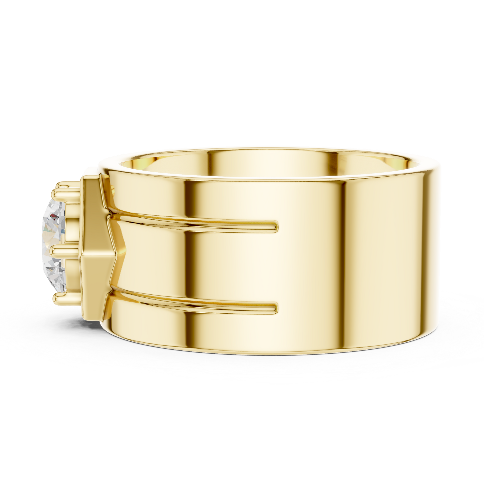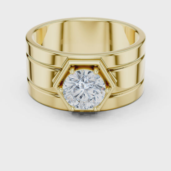 This bold men’s ring features a striking hexagonal bezel setting that securely frames a brilliant 1.40 carat lab-grown diamond at its core. The sculpted stepped band adds architectural depth and masculine strength, while the high-polish finish delivers commanding luxury with clean, modern lines.