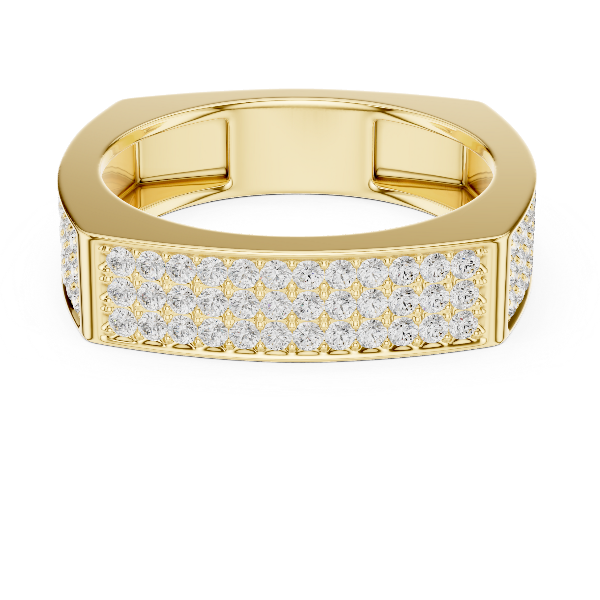 This bold ring is defined by its sharp, square-profile silhouette and meticulously arranged pavé diamond panels. Rows of precisely set lab-grown diamonds wrap across the top and shoulders, creating a rich grid of brilliance that contrasts beautifully with the clean, polished metal surfaces. The architectural geometry delivers a powerful, modern aesthetic while maintaining refined elegance and balance.