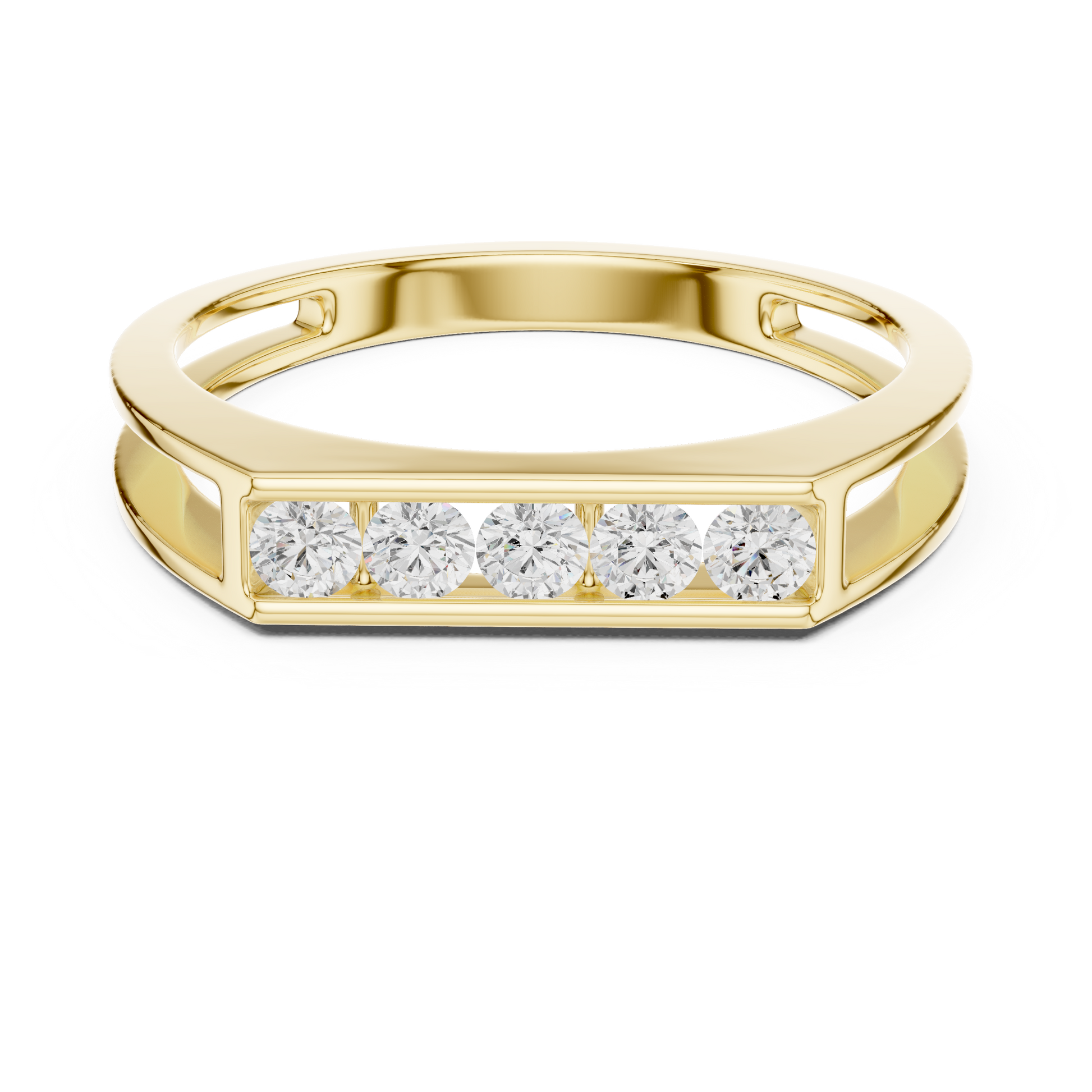 This modern ring features a clean horizontal diamond channel, showcasing a perfectly aligned row of lab-grown diamonds framed within a refined rectangular gallery. The open-sided architectural setting allows light to pass freely through each stone, enhancing brilliance while maintaining a sleek, low-profile silhouette. The balanced proportions and crisp edges give the design a confident, contemporary identity.