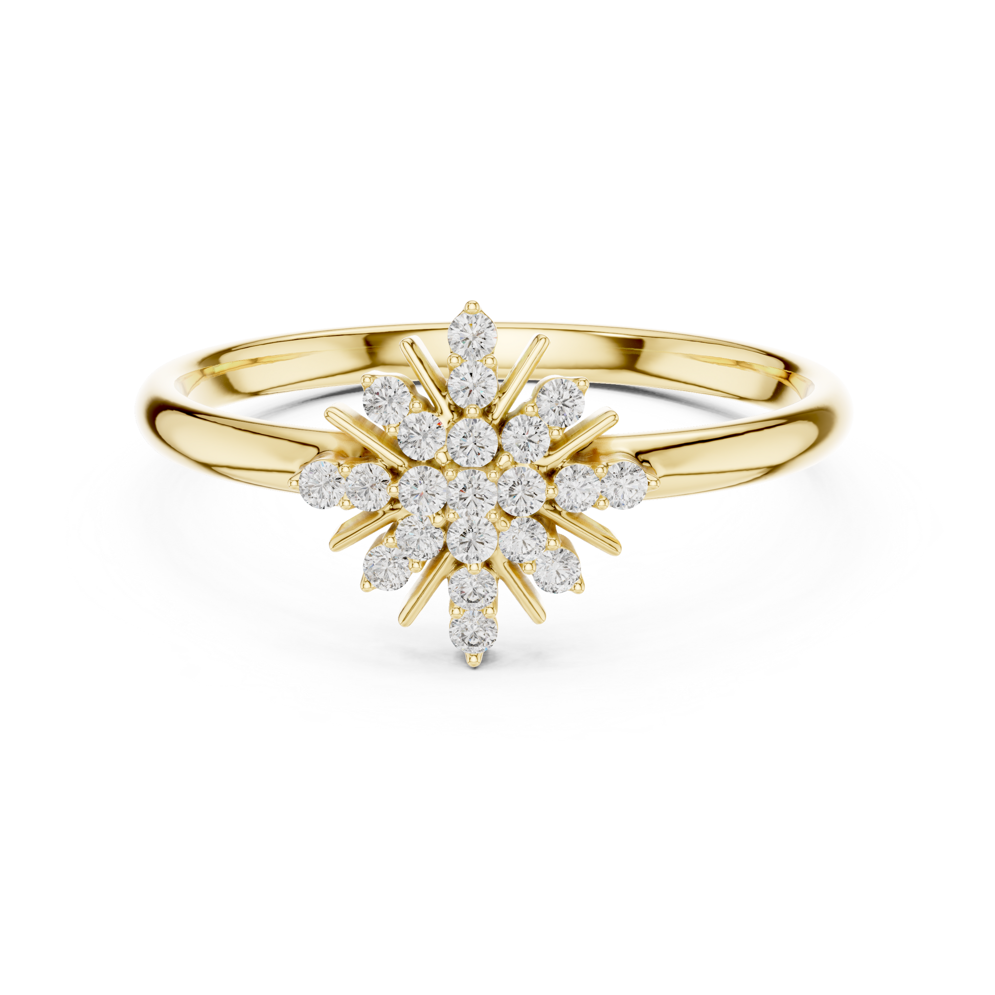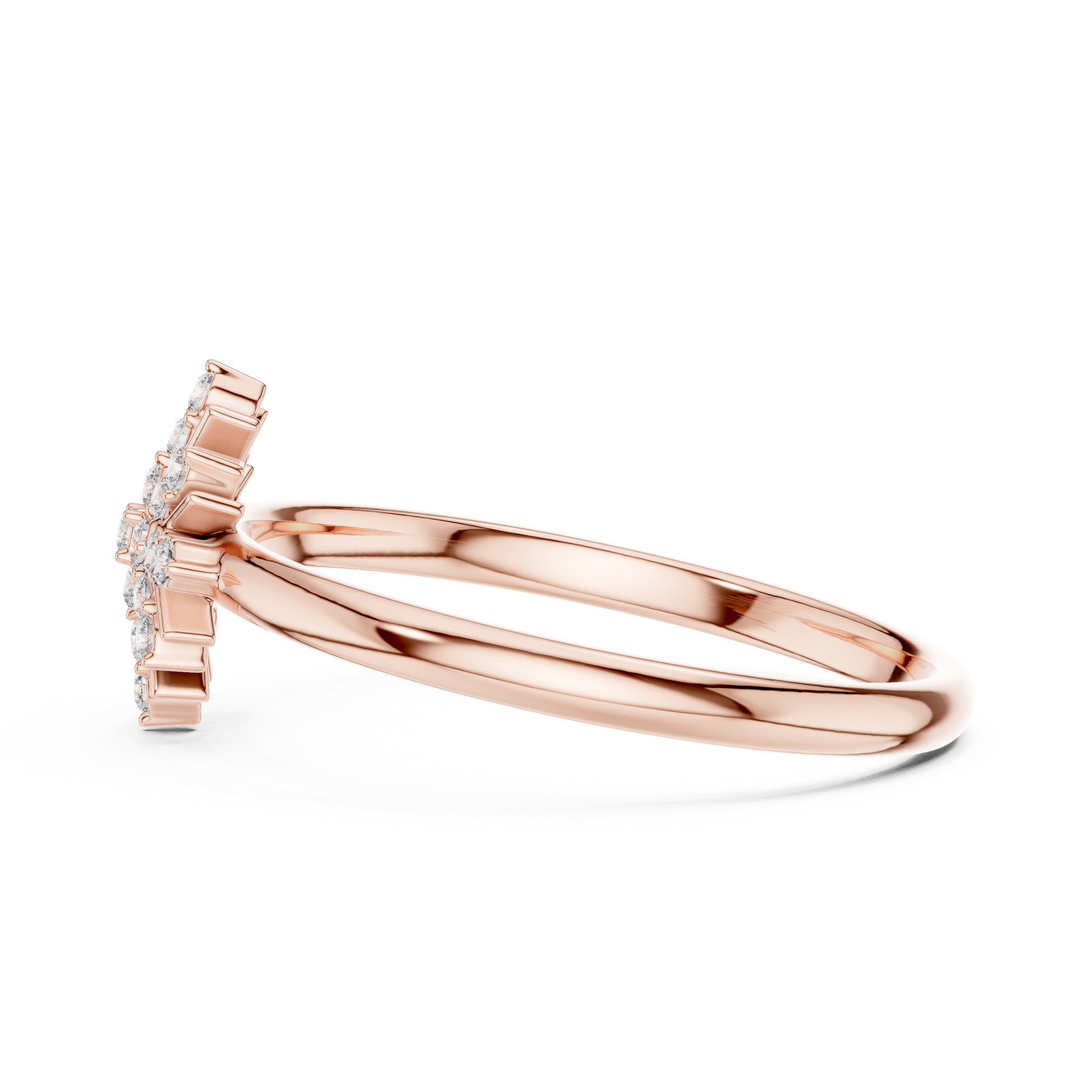 This striking design features a multi-point diamond constellation, where lab-grown diamonds radiate outward from a luminous core, creating a bold yet elegant starburst silhouette. Polished rose-gold prongs extend like beams of light, adding dimension, symmetry, and a powerful sense of motion. The result is a ring that feels both celestial and architectural—modern luxury with unmistakable presence.