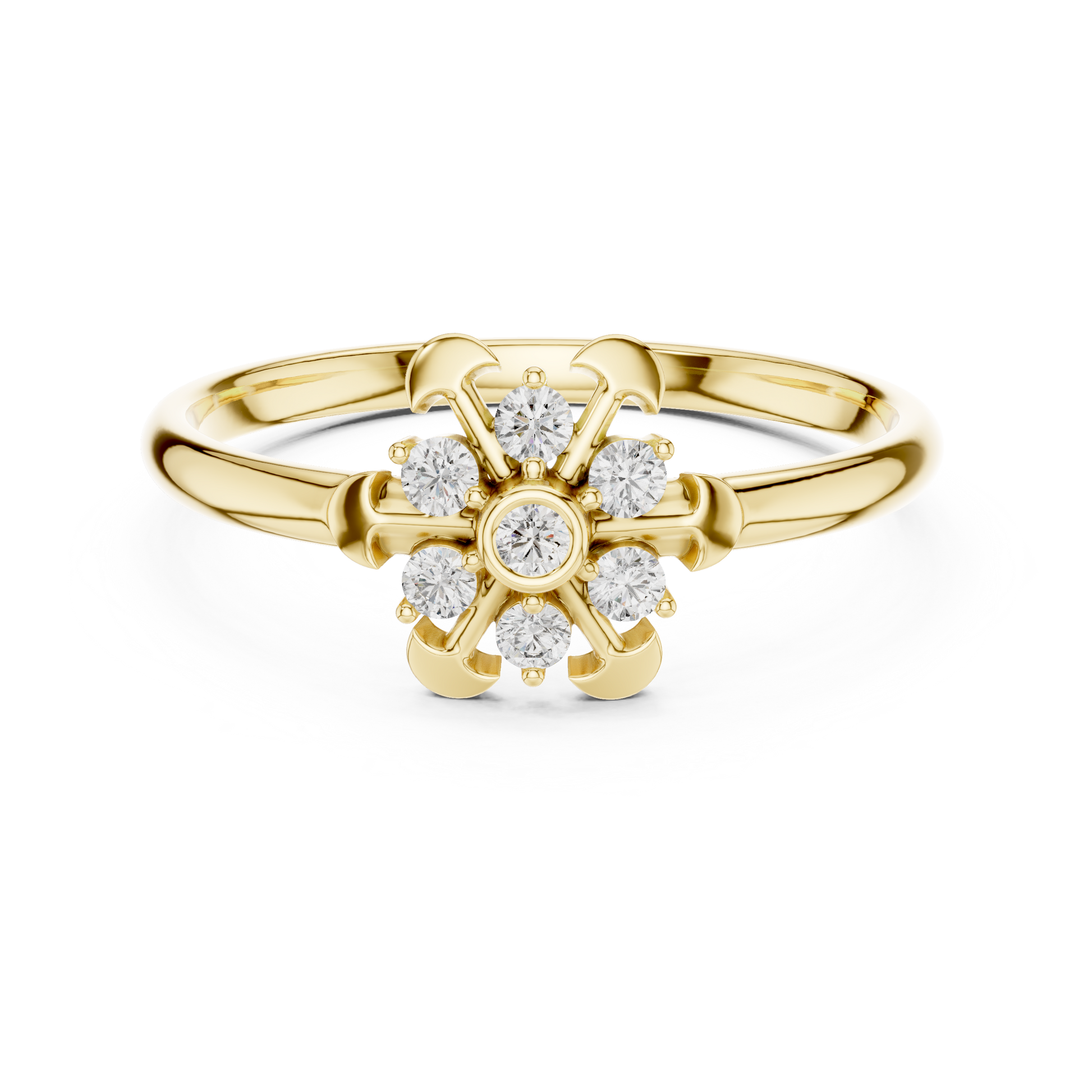 This striking design is inspired by a regal floral crest, featuring a radiant central lab-grown diamond embraced by perfectly balanced petals. The sculpted, shield-like arms create a bold yet graceful bloom, reflecting power, protection, and timeless beauty. Every curve is engineered to enhance brilliance from every angle.