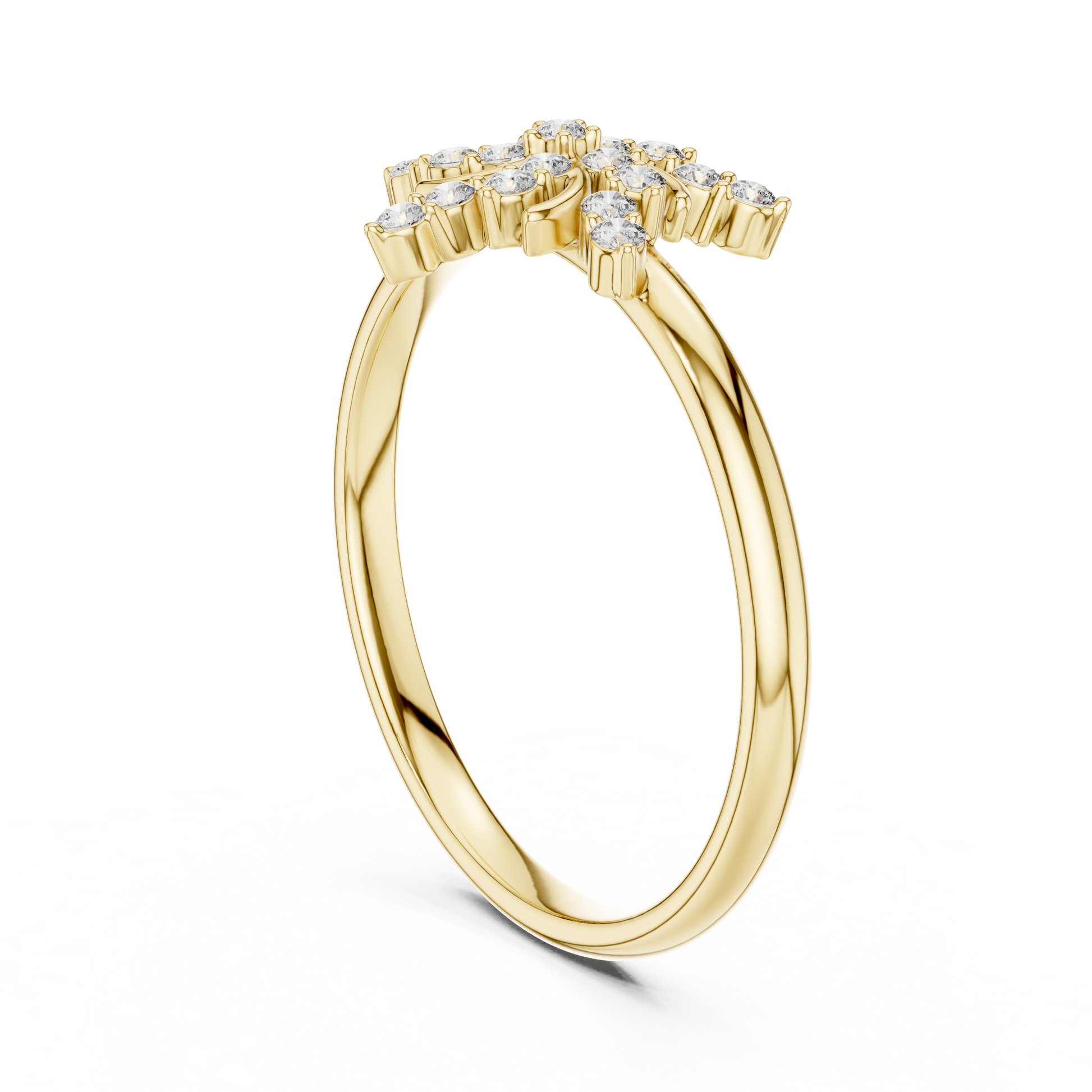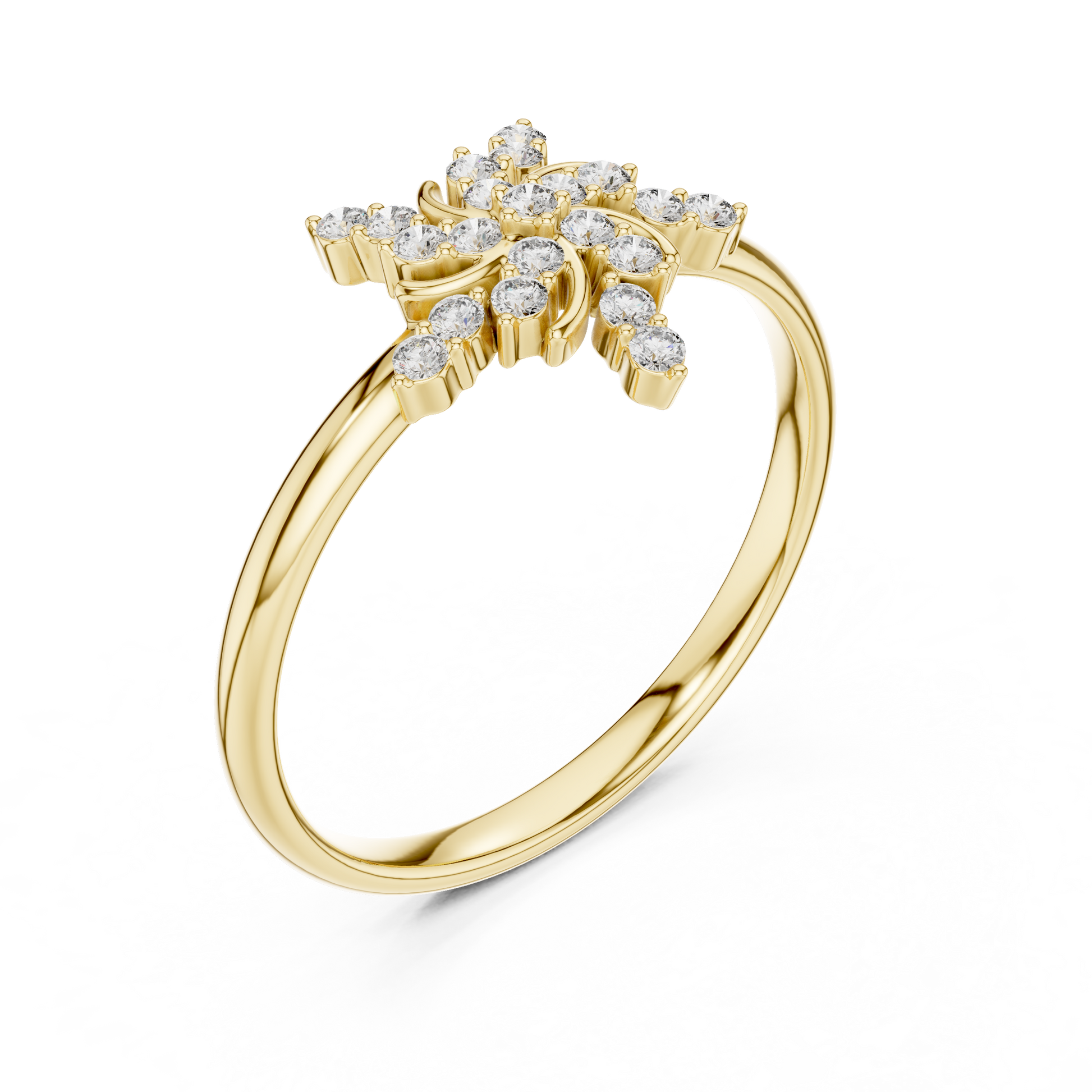 This ring showcases a dynamic floral–starburst composition, where lab-grown diamonds bloom outward in a harmonious, celestial pattern. Sculpted rose-gold curves weave gracefully between the diamonds, creating movement, depth, and a sense of luminous energy. The asymmetrical sparkle feels bold yet refined—capturing light beautifully from every angle.