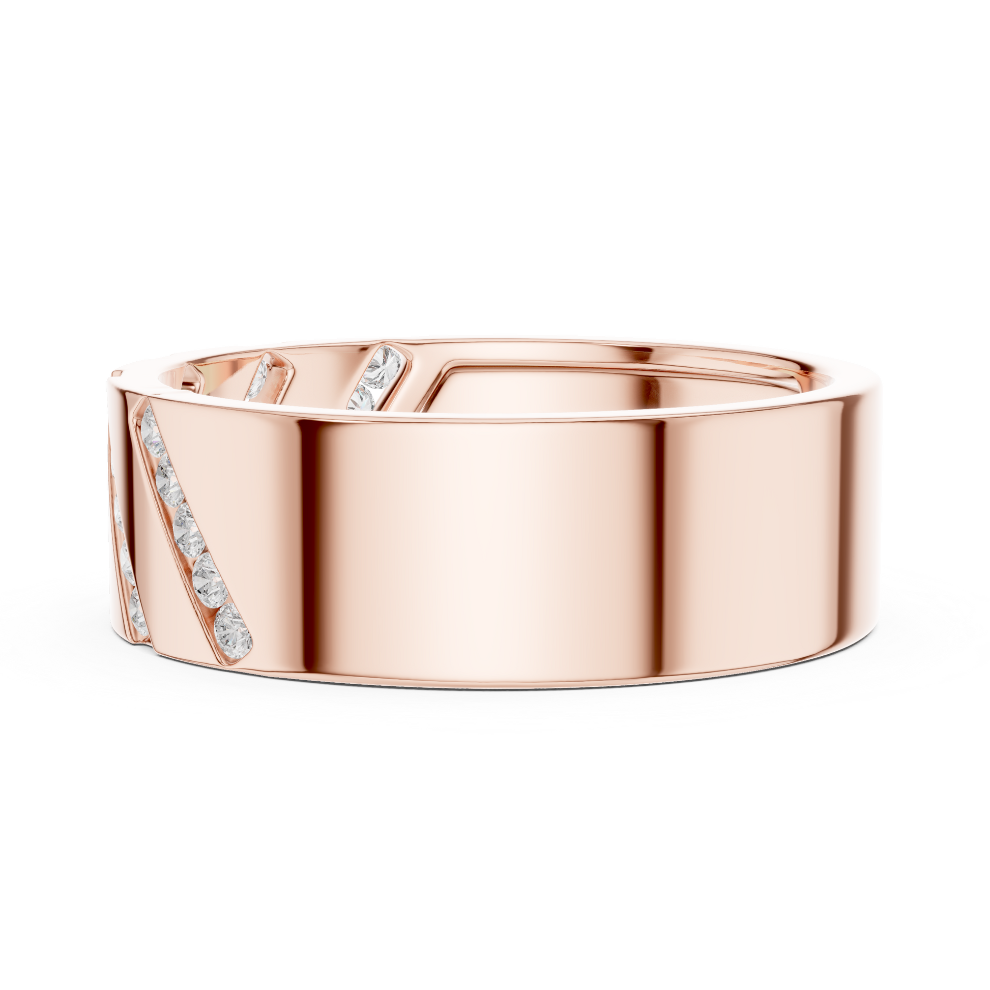 This powerful band is defined by its bold diagonal diamond channels, where precisely set lab-grown diamonds cut across sculpted metal panels with striking visual rhythm. The angular layout creates movement and depth, balancing high-polish metal surfaces with controlled sparkle. Each diagonal stripe is engineered to enhance light reflection while maintaining a strong, architectural presence that feels modern and assertive.